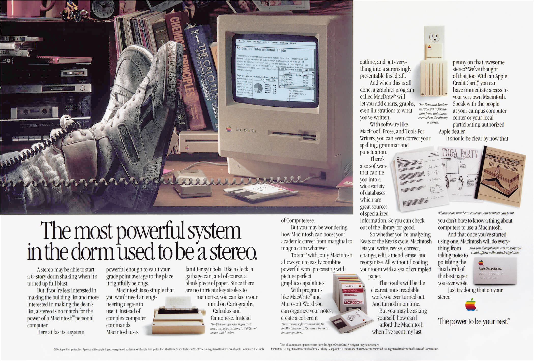 In 1984, I was a Sr. Art Director at BBDO San Francisco working on the Higher Eduction portion of Apple Computers. Back then, consumers read "long-copy" ads and creative teams busted their humps to make each ad as inviting to read as creatively possible. I love this ad for the photography. Every shot was an original — nothing stock. The headline, beautifully written, perfectly positioning the product. The body copy was crafted and re-crafted to flow and color the spread. But most of all, I helped create this ad at a time when art direction and concepts mattered.